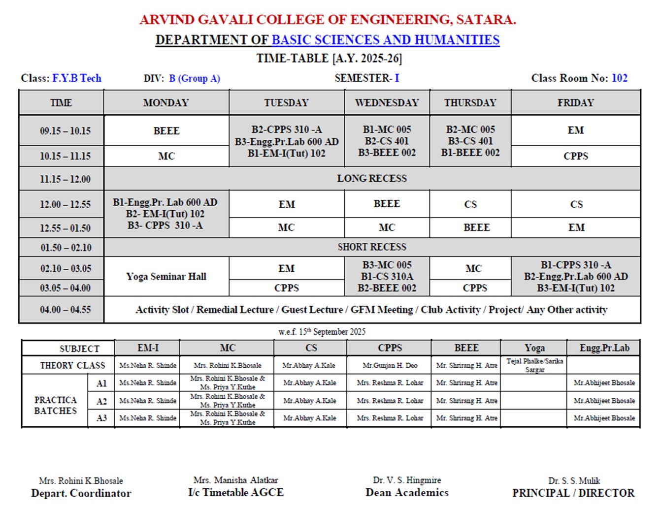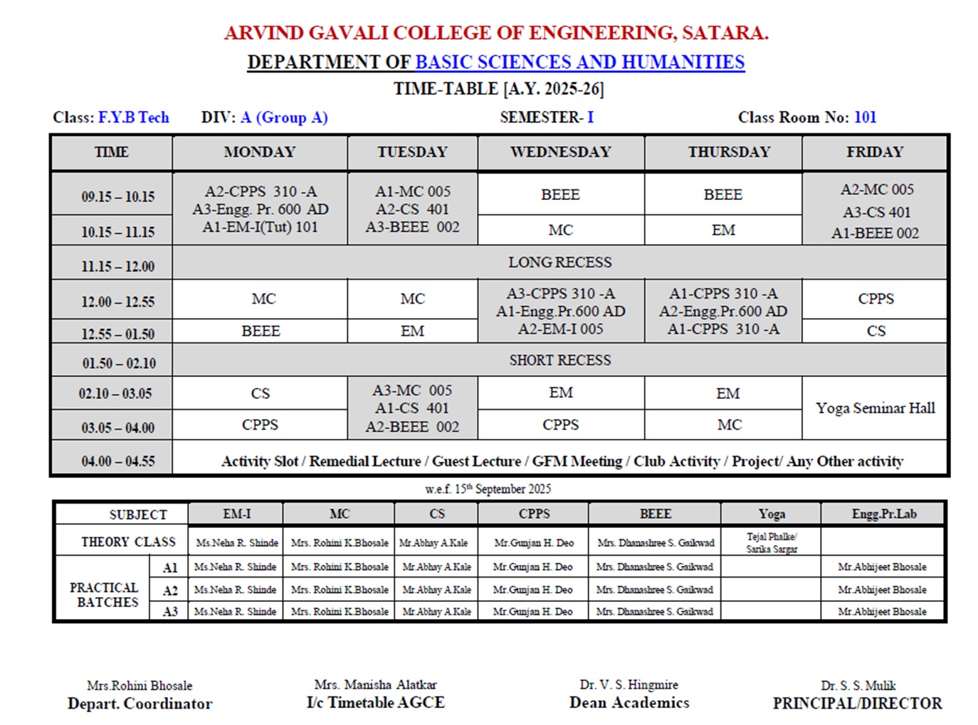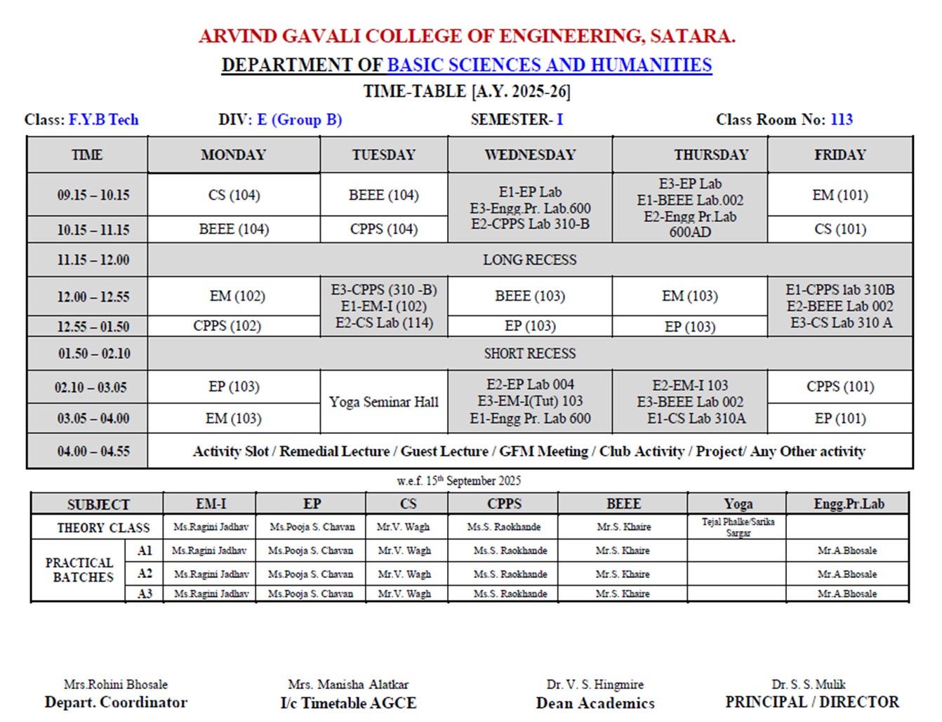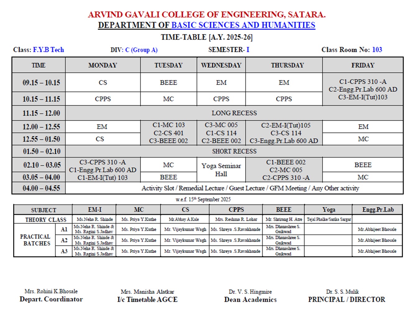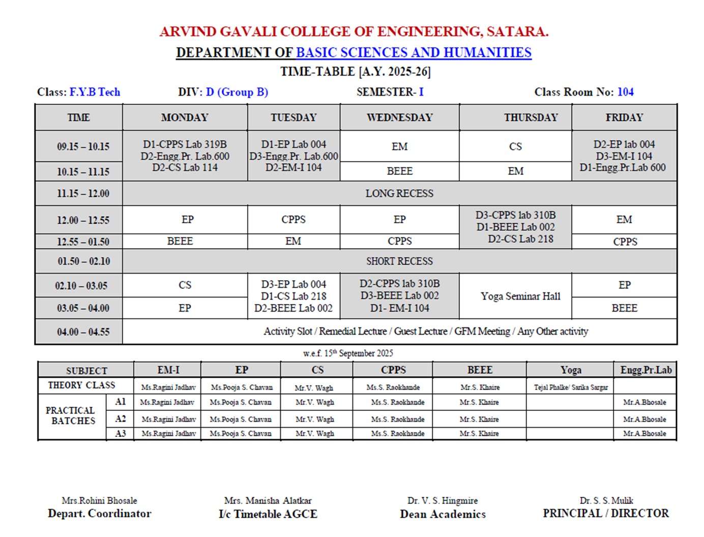 Timetable: Academic Calender 2025-26 Sem I_Autonomy Autonomy Div E Timetable Autonomy Div D Timetable Autonomy Div C Timetable Autonomy Div B Timetable Autonomy Div A Timetable NEW SYLLABUS FOR FY BTECH 2024-25 DEPARTMENTAL ACADEMIC CALENDAR 2024-25 (ODD) INSTITUTE ACADEMIC CALENDAR 2024-25 DBATU ACADEMIC CALENDAR 2024-25 ODD CA1 EXAM NOTICE 2024-25 FY-B.TECH TIMETABLE 2024-25 FY-B.TECH Syllabus 2024-25 CA1 EXAM TIMETABLE (EVEN SEM) UNIVERSITY ACADEMIC CALENDAR (EVEN SEM) Final Timetable and Load distribution 2023-24 Even sem Div-A Timetable Div-B Timetable Div-C Timetable Div-D Timetable Departmental Academic Calendar 2023-24 (Odd Sem) AGCE Academic Calendar 2023-24 (Odd and Even Sem) University Academic Calendar 2023-24 (Odd Sem)
