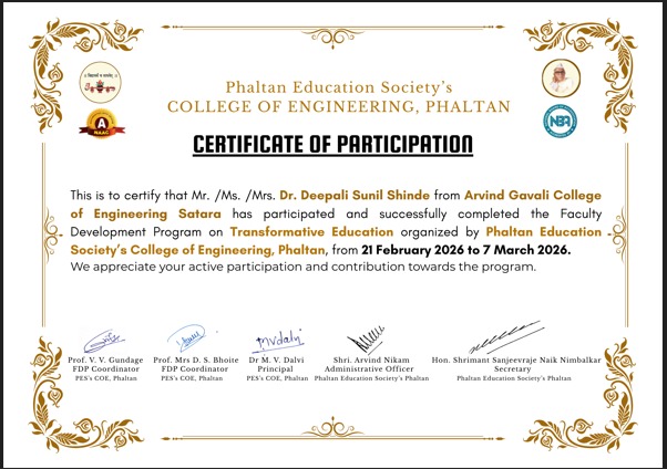 Faculty Development Program on Transformative Education organized by Phaltan Education Societys College Of Engineering , Phaltan , from 21 Feb to 07 March 2026