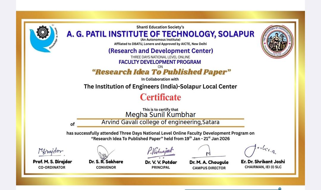 Certification of FDP "Research Idea To Publish Paper" which is held by A. G. Patil Institute of Technology, Solapur from 19th Jan to 21st Jan 2026